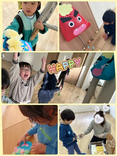 こんにちは! 2月3日の節分にちなんで教室でも節分のイベントを行いました。 お部屋にはカラーポリ袋で作った鬼を飾り、豆(カラーボール)を、 「鬼は外!福は内!」と元気よく投げました。 そのあと、みんなで作った新聞紙の金棒で鬼退治をしました... -